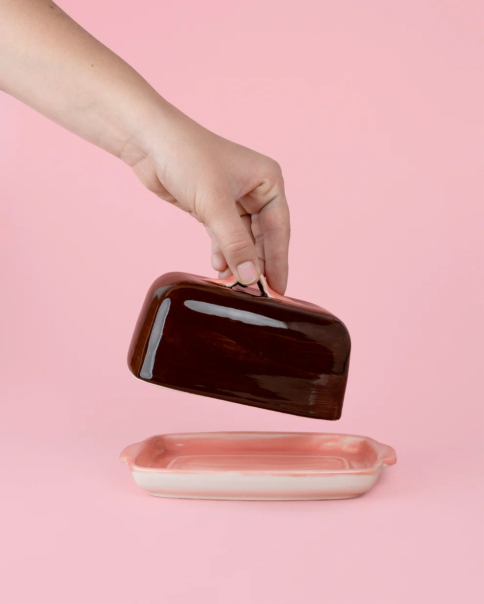 Handcrafted by Tierra Cocida, this artisanal ceramic butter dish brings rustic charm to your kitchen. The striking combination of soft pink and rich dark brown creates a warm, inviting aesthetic that complements any décor.
